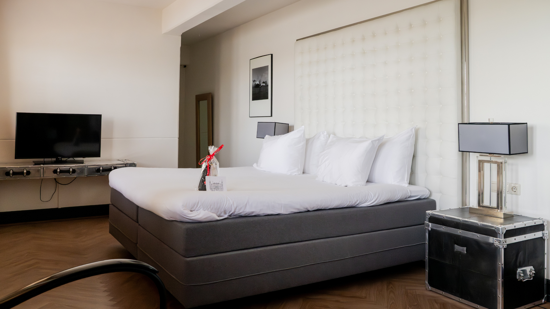 Deze mooie kamers hebben uitzicht over de Maas. Vanuit deze kamer heb je ook goed zicht op de Euromast, de cruiseschepen die voorbij komen en natuurlijk de leuke watertaxi’s. De sfeer in deze kamers is typisch Hotel New York: een warm interieur met een eigenwijze knipoog en een maritieme twist.
